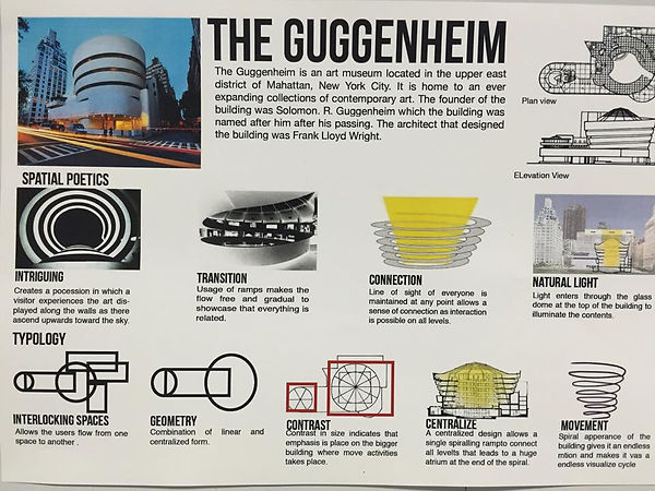 In this project, students have to identify and analyze spatial order and spatial poetics through precedent studies. The main aim is to analyse 2 selected architectural precedents. Each group of students is to analyse the spatial poetics & spatial typology of the selected precedents. The analysis of the design approaches will inform the preceding design projects for the remaining semester. For my group, we choose Guggenheim museam, New York and Parthenon, Greece.